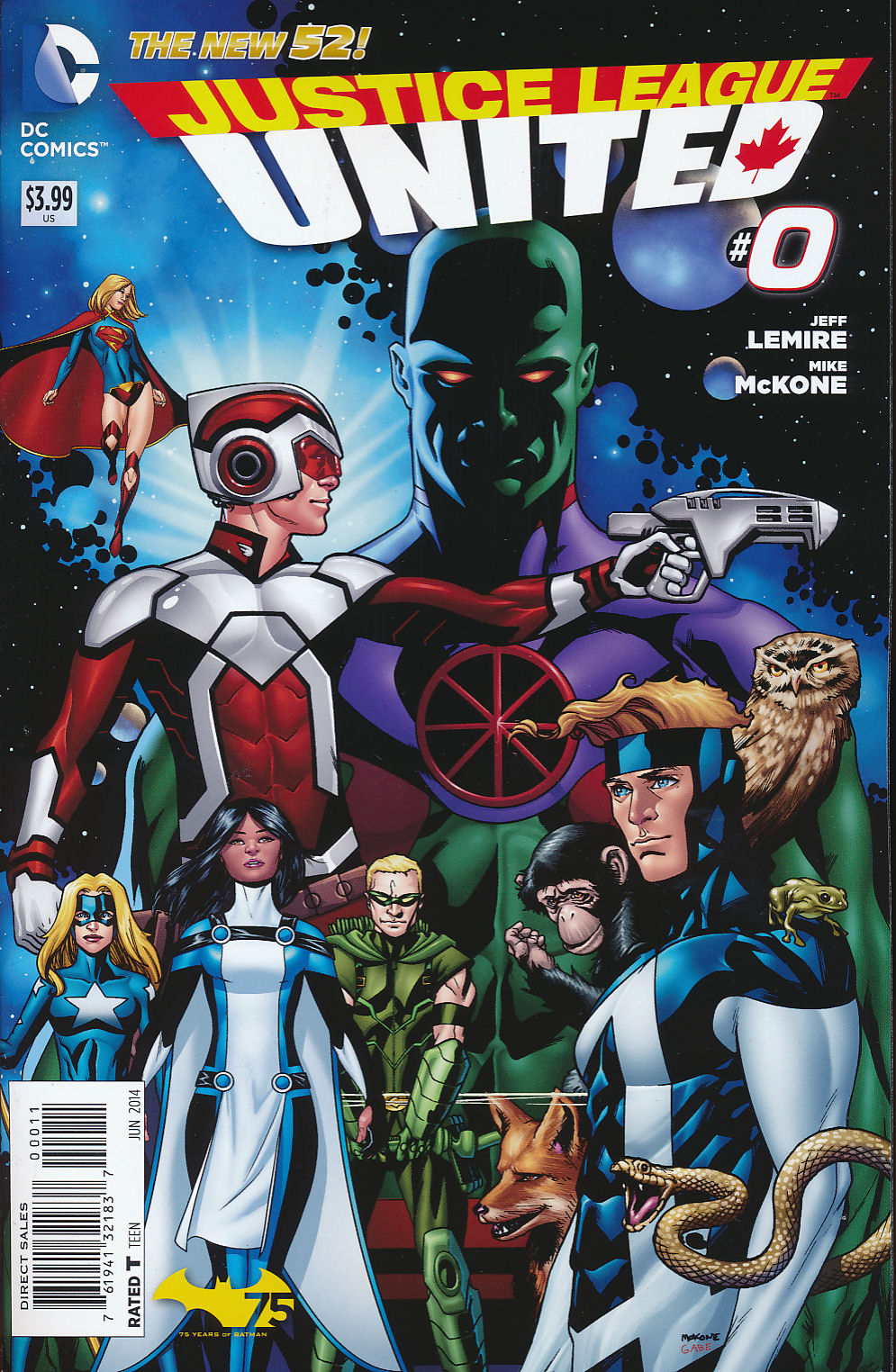 Skrevet af Jeff Lemire. Top comics writer Jeff Lemire teams with superstar artist Mike McKone for the all-new monthly series JUSTICE LEAGUE UNITED, starring the new team of powerful heroes Earth calls Justice League Canada! In the aftermath of FOREVER EVIL, Adam Strange is caught up in an adventure across the far reaches of the cosmos that will unite an unexpected team of heroes including Supergirl, Hawkman, Green Arrow, Stargirl, Martian Manhunter and Animal Man - but if they're on the team, who exactly is Canadian? Plus: Don't miss the debut of a new Canadian hero who will have a huge effect on the group!