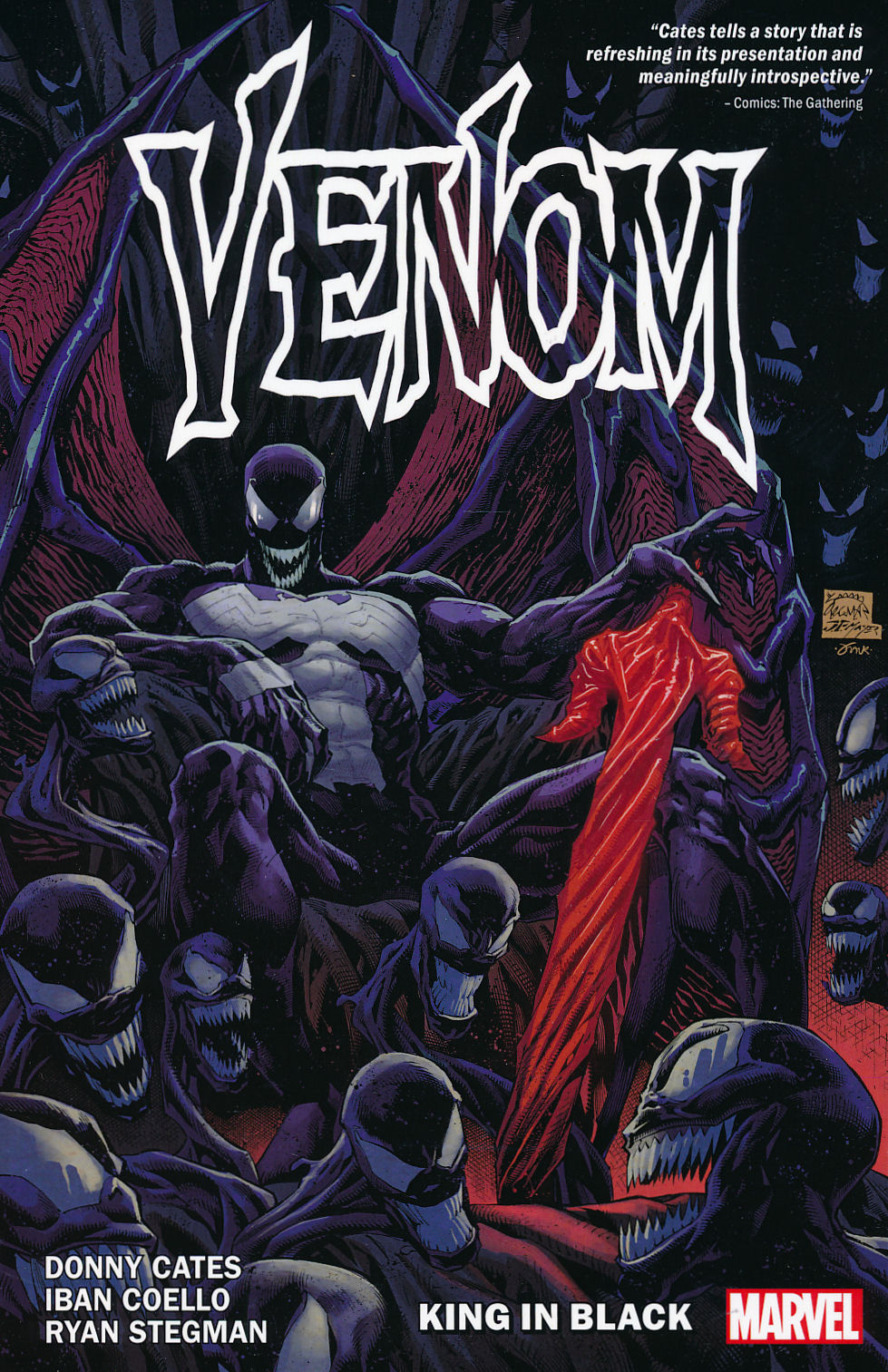 Collecting VENOM (2018) #31-35. Donny Cates and Ryan Stegman bring their three-year saga to a stunning close! The horrifying threat of the King in Black, all-powerful god of the symbiote race, has loomed large for years. Now, after millennia of imprisonment, Knull and his symbiote army have arrived on Earth! But what is Knull's hideous agenda? And what happens to Venom when he finally comes face-to-face with the lord of the abyss? Eddie Brock is about to face the biggest challenge of his life, but he's not alone. Who will stand by his side in Earth's darkest hour? And do any of them have the slightest chance of success? Nothing will ever be the same for the Lethal Protector!