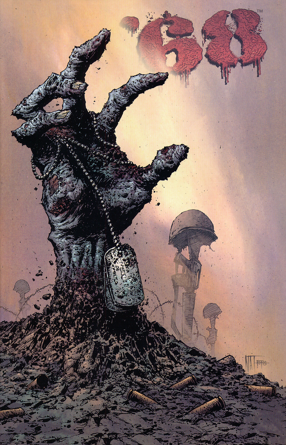 The zombies are back in the razorwire, as Meatgrinder Studios and Image Comics present the official ’68 Compendium Edition. This massive tombstone of a volume presents 752 pages of Vietnam zombie mayhem, collecting the full 30 issue comics run of the groundbreaking horror series! On February 13, 1968, during the darkest days of the Vietnam conflict, the gates of hell opened wide, unleashing new and hungry life into the countless war-torn dead. From the original ’68 one-shot, to the first four-issue mini-series, the introduction and first appearance of the legendary "Jungle Jim" and beyond, this is the absolute ’68 collection, offering up every red, dripping bit! The full series, the one-shots and the short backup stories are all here, in full, jaw-snapping, flesh-rending full color! Get “small” in your foxhole and keep your powder dry! The hungry undead have risen in the Age of Aquarius…and there’s not enough Napalm in the world!