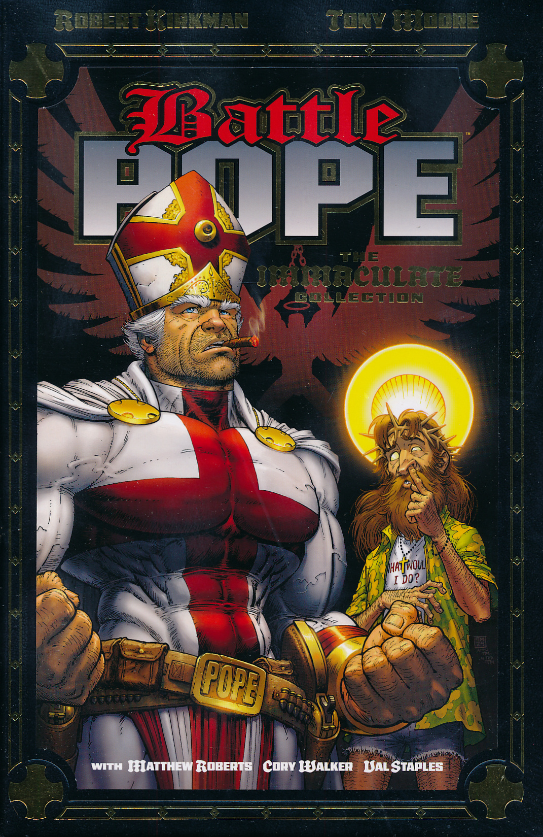 What do you do when the world’s ending, and most of humanity can’t get into heaven? CALL BATTLE POPE. When Heaven, Hell, and everything in between go to war, you better hope your prayers don’t get answered by anyone but Battle Pope. Once condemned by God Almighty for his hard drinkin’, womanizing evil ways, Pope has one last chance at salvation, and he’ll greet it twin Uzis and the help of his new roommate, Jesus H. Christ. The iconic series from visionary ROBERT KIRKMAN (INVINCIBLE, THE WALKING DEAD), TONY MOORE (Punisher), **MATTHEW ROBERTS **(MANIFEST DESTINY) and CORY WALKER (INVINCIBLE) is presented in a single volume for the very first time to celebrate its 25th anniversary!