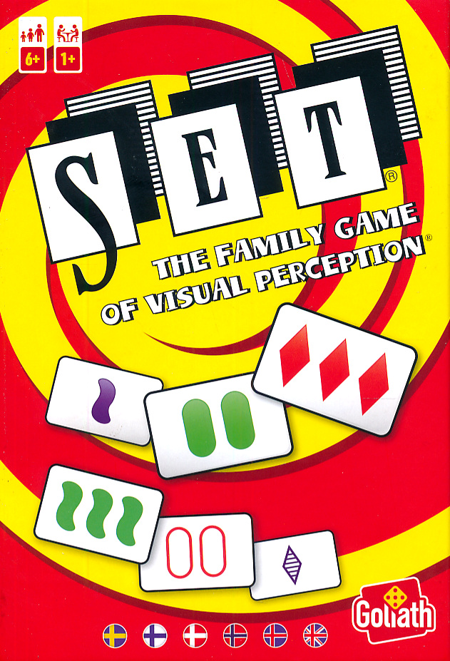 SET is a game of visual perception; a fascinating challenge for either solitaire or competitive play. To create a SET, a player must locate three cards in which each of the four features is either all the same on each card or all different on each card, when looked at individually. The four features are, symbol (oval, squiggle or diamond), color (red, purple or green), number (one, two or three) or shading (solid, striped or open). Age is no advantage in this fast paced family game. SET is great fun for the whole family because there is no previous knowledge required.